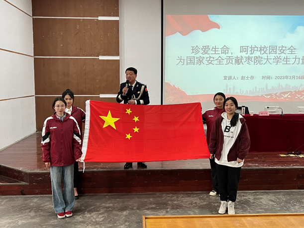 然后,用从国庆观礼中带回的国旗,向同学们讲述了《红岩》中“绣红旗”的片段,感召新时代青年用坚定信仰和为国家安全奋斗牺牲的革命精神,赓续中华民族伟大复兴中国梦。