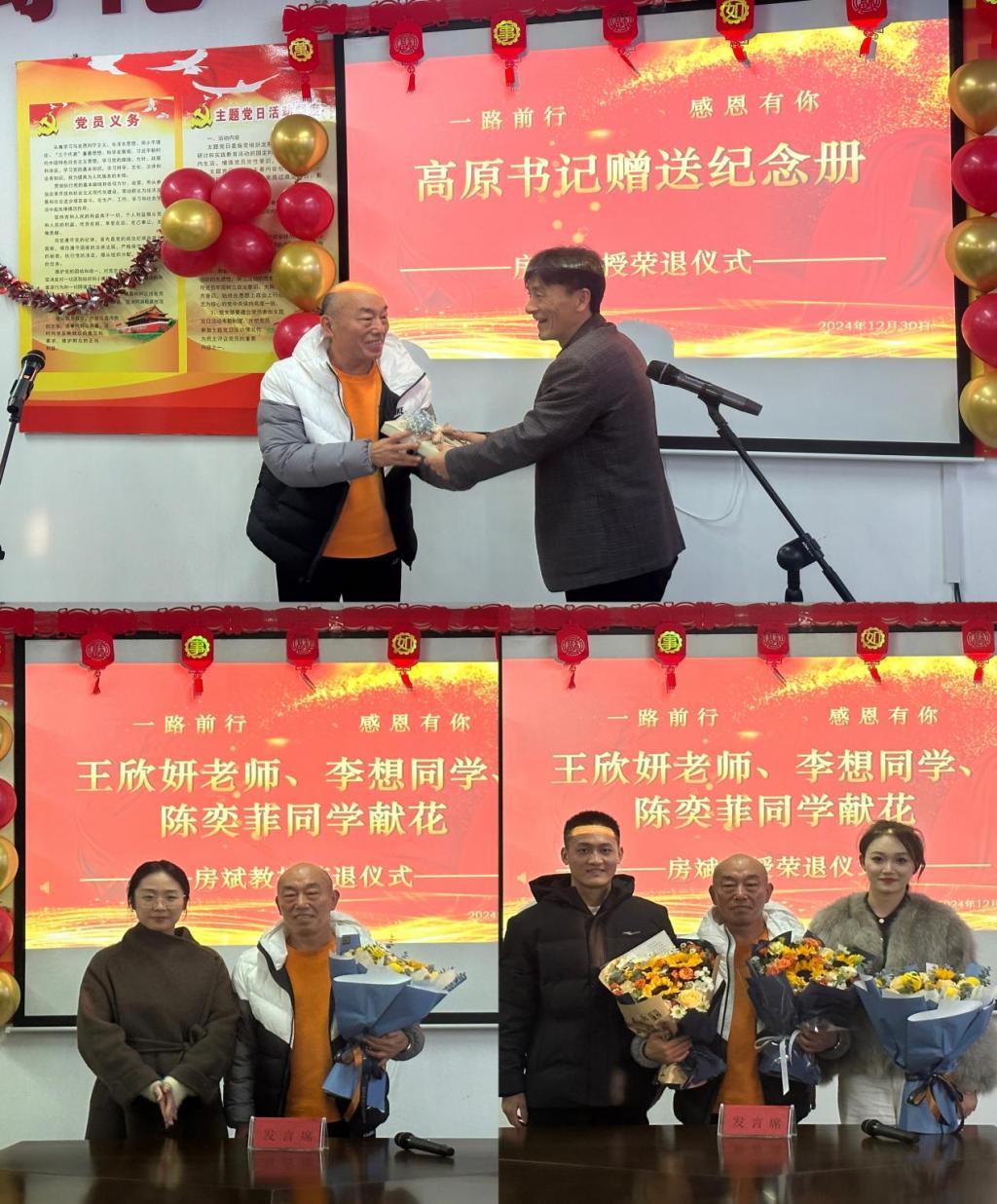 党委书记高原代表w66旗舰厅向房斌教授赠送纪念册,教师代表和员工代表向房教授赠送鲜花。