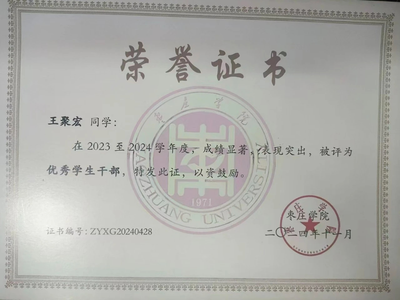 在“学业优先”的理念下,王聚宏交出了亮眼的成绩单:大二下学期班级综合测评排名第一,顺利通过英语四级考试,同时还担任班级学习委员,以自身行动带动身边同学共同进步。“在保证学业的前提下追逐足球梦想”,成为他平衡专业学习与竞技训练的核心准则。