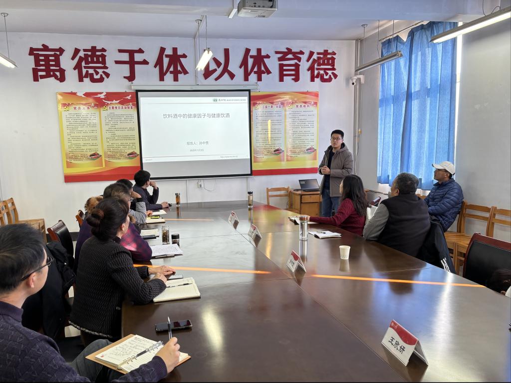 在主题研讨环节,食药公司孙中贯博士作了题为《饮料酒中的健康因子与健康饮酒》的报告,着眼于酒中高级醇这一化学成分,围绕饮酒、营养、健康等问题进行了专题探讨;任昭君教授、田祯祥副教授、王欣妍老师就运动人体科学、体医融合、运动促进健康等方面,分别介绍了取得的经验成果和下一步研究方向。
