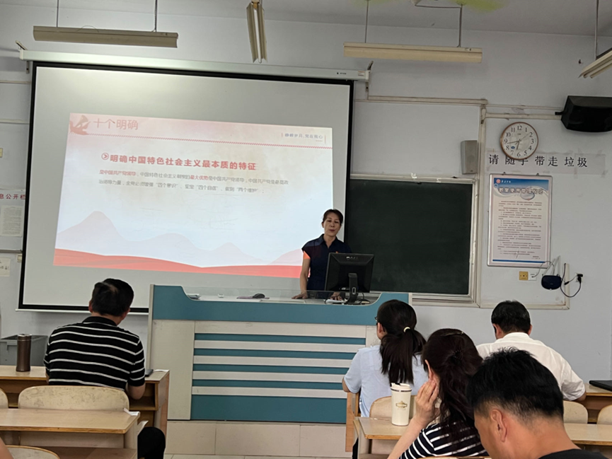 李丽以《深刻领会十个明确的战略思想和创新理念》为题,从主题教育的总要求“学思想、强党性、重实践、建新功”展开,阐述了为什么说“十个明确”是对习近平新时代中国特色社会主义思想的核心内容的进一步概括,以及“十个明确”对中国特色社会主义现代化建设的深刻内涵和重大意义。