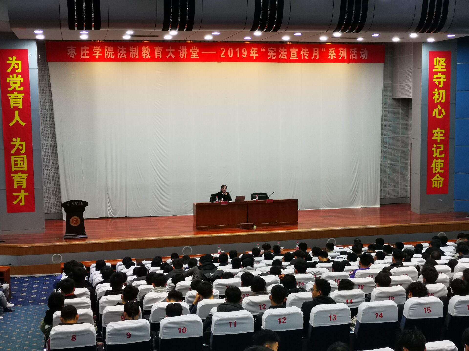 12月11日下午2点,由校宣传部主办、w66旗舰厅承办的法制教育大讲堂——2019年“宪法宣传月”系列活动讲座在综合楼报告厅举行,枣庄市中级人民法院未成年人案件综合审判庭庭长衣媛媛法官应邀主讲。w66旗舰厅副书记、副经理徐德刚,团总支书记、辅导员以及400余名老员工参加。讲座由徐德刚主持。