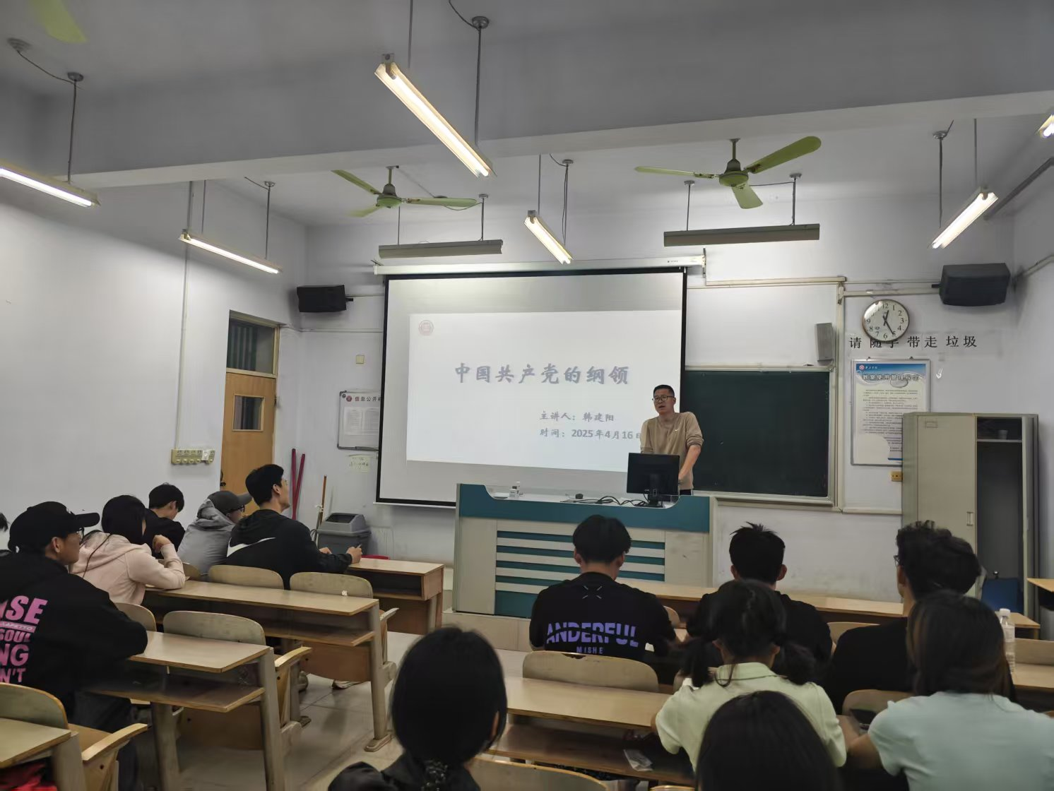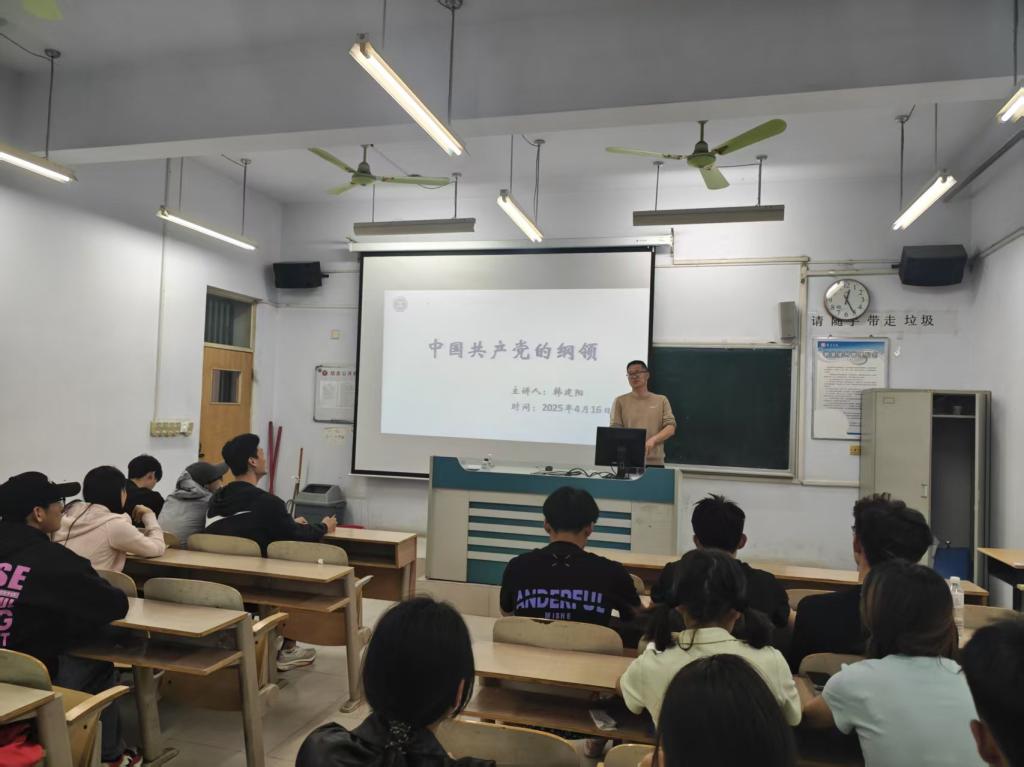 韩建阳以《中国共产党的纲领》进行授课。首先,韩建阳从党的纲领概念讲起,阐述党的最高纲领是实现共产主义,这是党始终不变的追求,同时介绍了党在不同阶段为实现最高纲领制定的阶段性目标和基本路线,如党在社会主义初级阶段“一个中心、两个基本点”的基本路线,以经济建设为中心,坚持四项基本原则,坚持改革开放,为把我国建设成为富强民主文明和谐美丽的社会主义现代化强国而奋斗。然后,韩建阳结合党史,从新民主主义革命时期党为推翻“三座大山”、建立新中国的奋斗,到社会主义建设时期对社会主义道路的探索,再到改革开放后中国特色社会主义事业的蓬勃发展,生动讲述了党在不同历史阶段为实现纲领所做的努力。最后,韩建阳强调党的纲领和章程是党统一思想与行动的准则,是党的整体意志体现,是规范党内生活,处理党内关系的根本依据。