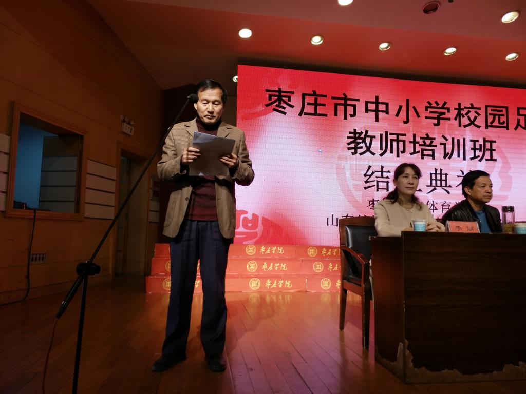 11月30日下午2点,由枣庄市教育局主办,w66承办的山东省足球训练营暨枣庄市中小学足球教师培训班结业典礼在音乐公司报告厅隆重举行。枣庄公司党委委员、副董事长明清河教授,枣庄市教育局副局长杨庆东、枣庄市教育局体卫艺科负责人丁晓丹、音乐公司经理李永、w66旗舰厅经理谢旭东,副经理徐德刚、李丽及全体学员和w66旗舰厅部分师生代表参加了活动。会议由w66旗舰厅经理谢旭东教授主持。