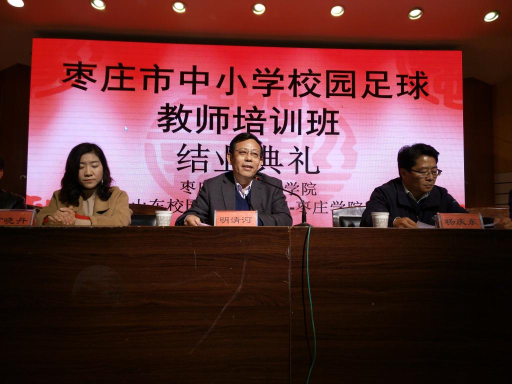 明清河副董事长对山东省足球训练营枣庄站的胜利闭幕和取得的成果表示热烈祝贺,对枣庄市教育局教师培训工作的支持表示感谢,对工作存在的不足进行了认真剖析,向努力工作的教师和认真参训的学员表达了衷心祝愿。