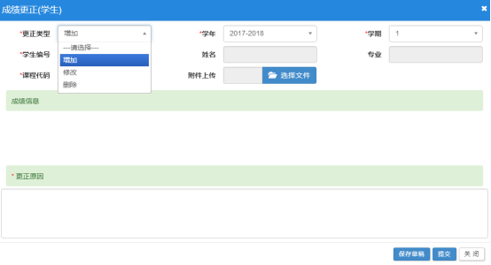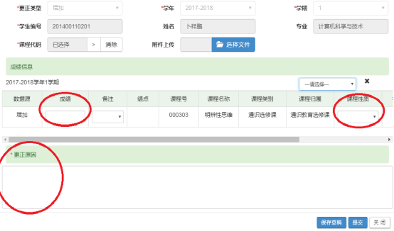 5.如果是修改或增加原始课程成绩,在这里选择课程性质,录入成绩,填写更正原因,就可以保存提交了,单击提交按钮即可。