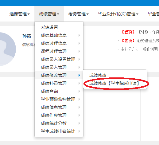 1.进入成绩修改管理-成绩修改(员工院系申请)界面进行相应设定。