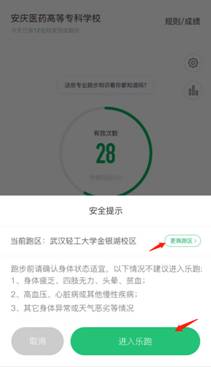 点击“进入乐跑”,弹出安全提示,点击进入乐跑,开始跑步;点击“更换跑区”,进入乐跑设置(可见3.2),更换跑区;
